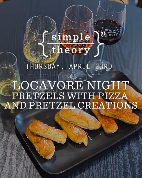 Join us for Locavore Night at Simple Theory Wine Co. as we celebrate local flavor with our friends at Pretzel & Pizza Creations. Born right here in Frederick, Pretzel & Pizza Creations has built their story around one simple philosophy: “It all starts with the dough.” Their traditional Bavarian-style soft pretzels are handcrafted from a closely guarded, house-blended flour recipe — and you can taste the difference in every bite.